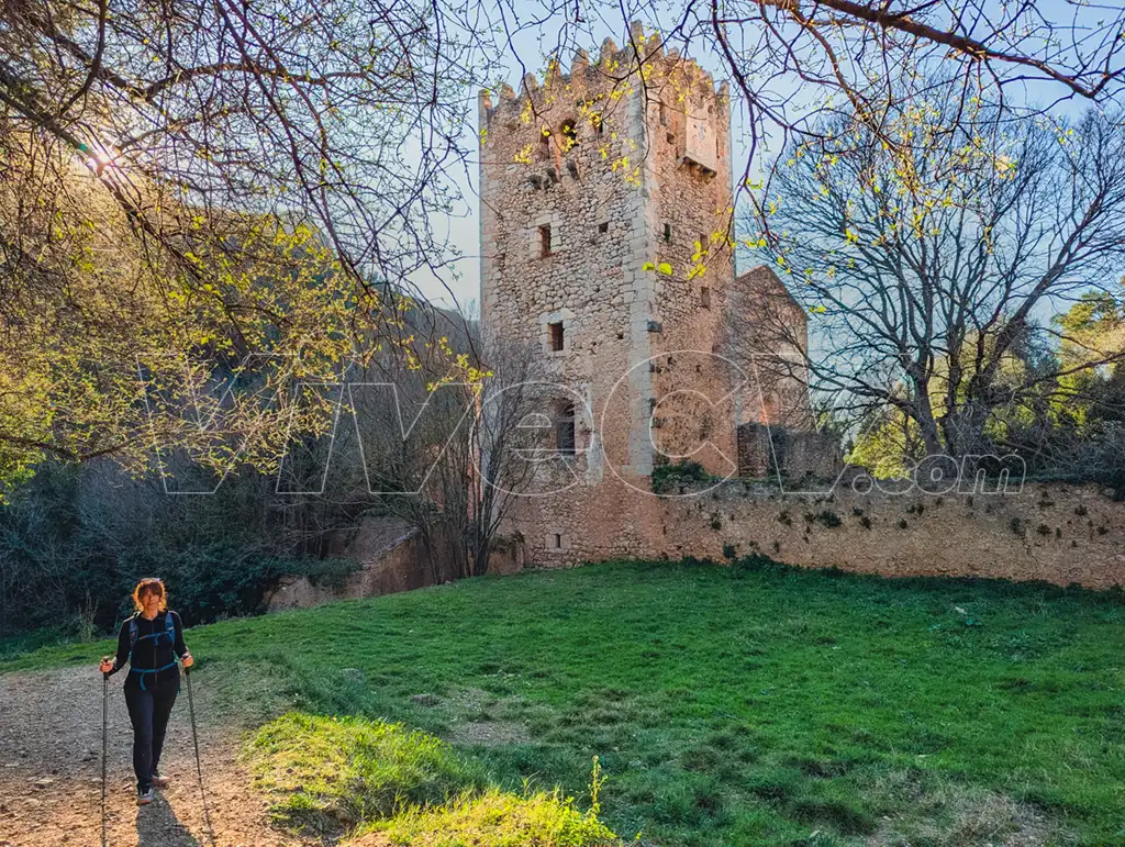 Continuamos por pista forestal y, tras aproximadamente un kilómetro, llegamos a las ruinas del antiguo monasterio. Cruzamos el puente de Felipe II y tomamos la senda histórica, SL-CV 82, que bordea el monasterio y nos conduce junto a las antiguas balsas.