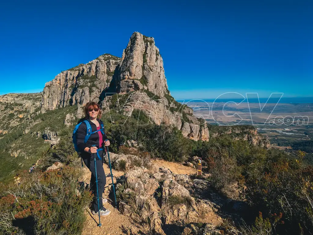 La recompensa es extraordinaria. Desde la cruz disfrutamos de amplias vistas hacia la costa, con Cullera y la llanura litoral del río Xúquer, y hacia el interior, donde destacan la Serra de Corbera, Serra de les Agulles y el Cavall Bernat, muy próximo y emblemático dentro de esta sierra.